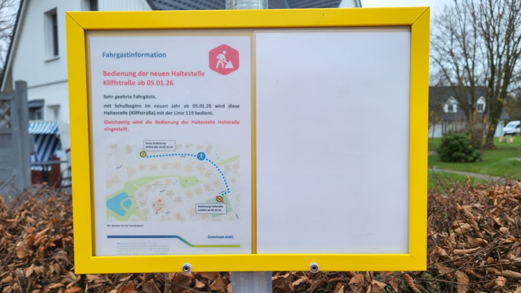 Die Bushaltestelle "Nienhagen - Kliffstraße" der Linie 119 von REBUS wird seit dem Schulbeginn im neuen Jahr am Montag, den 5. Januar 2026 bedient.